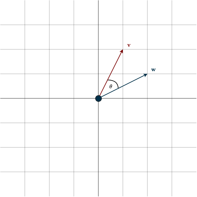 - The dot product also allows us to measure the exact angle between two vectors: \(\theta = \cos^{-1}(\frac{\mathbf{v}_1 \cdot \mathbf{v}_2}{||\mathbf{v}_1||||\mathbf{v}_2||})\)