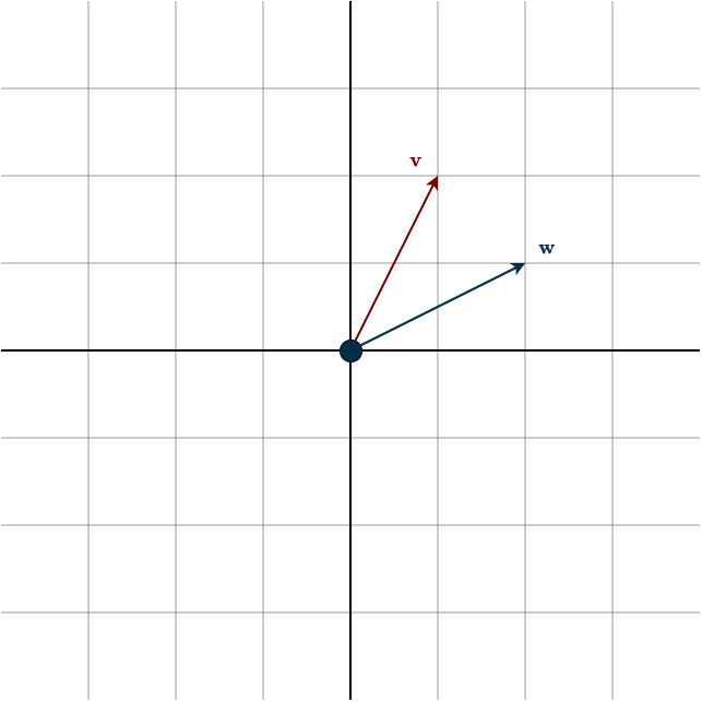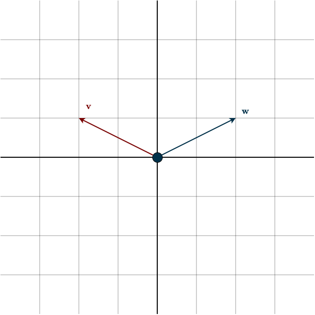\(\mathbf{v} = \begin{bmatrix} 2 \\ 1 \end{bmatrix}, \hspace{1cm} \mathbf{w} = \begin{bmatrix} 1 \\ 2 \end{bmatrix}\)