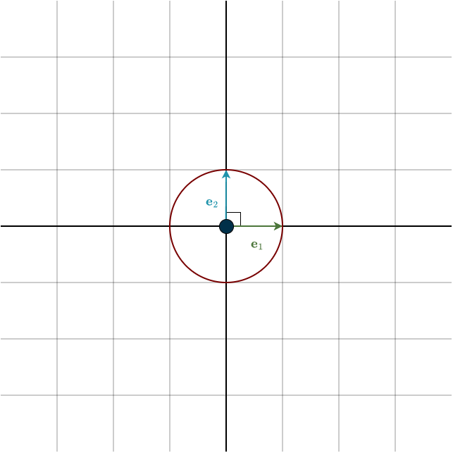 I want to briefly highlight what an orthonormal basis is, since it will be important later on. Recall that we need a basis to create coordinate representations and, in turn, matrices. However, the choice of basis is completely up to us, and there are many options. Among them is a special class called an orthonormal basis. “Ortho” means orthogonal, and “normal” means unit length, that is, length one. Simply put, in such a basis every vector is perpendicular to every other vector, and all of them have length \(1\). The standard basis is a perfect example of this, but there are others, namely, rotated versions of it. In \(\mathbb{R}^2\), these form the unit circle, a circle of radius one, and in \(\mathbb{R}^3\), the unit sphere.