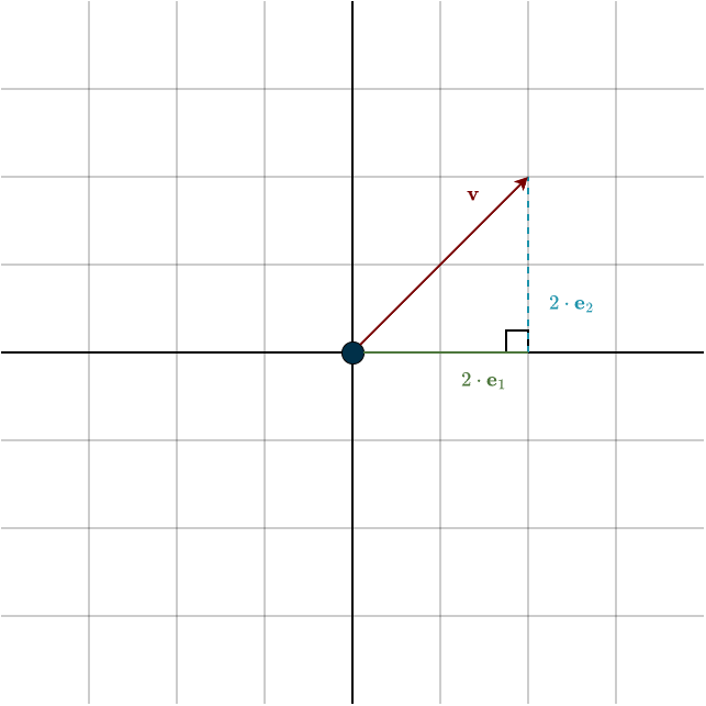 At this point, one subtle but important choice enters the picture: the basis vectors define our coordinate system. We choose the standard basis vectors \(\mathbf{e}_1\) and \(\mathbf{e}_2\) to have length \(1\). This isn’t the result of a theorem, it’s a definition, a choice. We simply decide that one unit step along either axis corresponds to one unit of length. This choice makes geometry and algebra line up nicely.