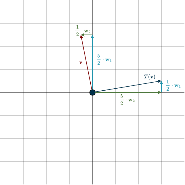 These coefficients give the coordinates of \(T(\mathbf{v})\) in the output basis, completing the representation. (Solving for these coefficients can be done either by solving a system of linear equations or by using a change-of-basis matrix.)