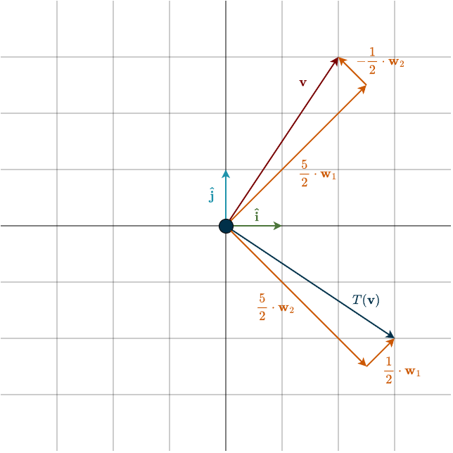 Now, focus on the left subfigure above and compare it with the figure at the top of this section. Our goal is to express \(T(\mathbf{v})\) using only \(\mathbf{w}_1\)​ and \(\mathbf{w}_2\)​. At this point, it’s clear that the coordinates we currently have are incorrect (scaling \(\mathbf{w_1}\) by \(3\) and \(\mathbf{w_2}\) by \(2\), then adding the results, would produce a vector lying in the upper-right quadrant, whereas \(T(\mathbf{v})\) should lie in the quadrant directly below it.), because they are still expressed with respect to the standard basis. To fix this, we need to convert them to the output basis. By solving for the coordinates in the output basis, we obtain the following result: