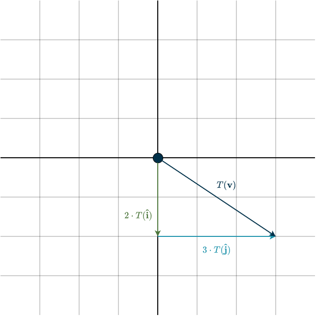 \(T(\mathbf{v}) = 2 \cdot T(\mathbf{\hat{i}}) + 3 \cdot T(\mathbf{\hat{j}}) = \begin{bmatrix} 3\\ -2\\ \end{bmatrix}\)