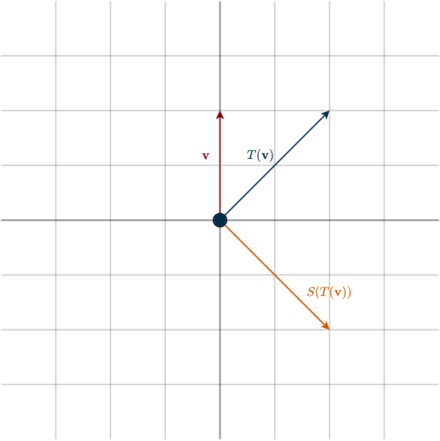 The product \(ST\) is simply the composition of functions: you apply one transformation to a vector, then take the result and feed it into the other. This composition is read from right to left, since the rightmost transformation is applied first.