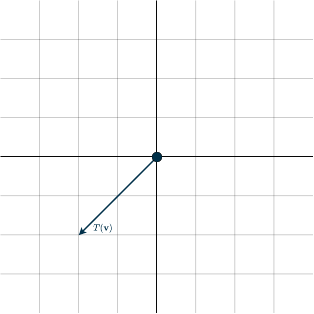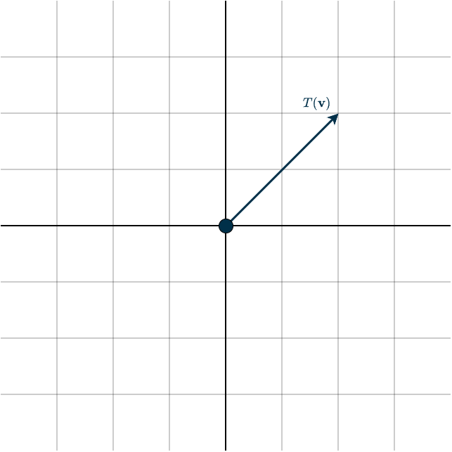 We call this machine a transformation. More specifically, we will focus on linear transformations, which we will denote by \(T\). For any input vector \(\mathbf{v}\), the expression \(T(\mathbf{v})\) represents the output vector produced by the transformation.