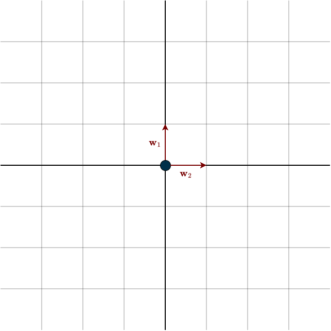 \(\mathbf{w}_1 = \begin{bmatrix} 1\\ 0\\ \end{bmatrix}, \hspace{1cm} \mathbf{w}_2 = \begin{bmatrix} 0\\ 1\\ \end{bmatrix}\)