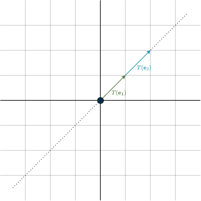 Here the columns are multiples of each other. This means the two different basis vectors are both mapped into the same one-dimensional span of the vector \((1,1)\).