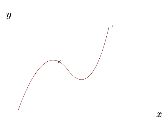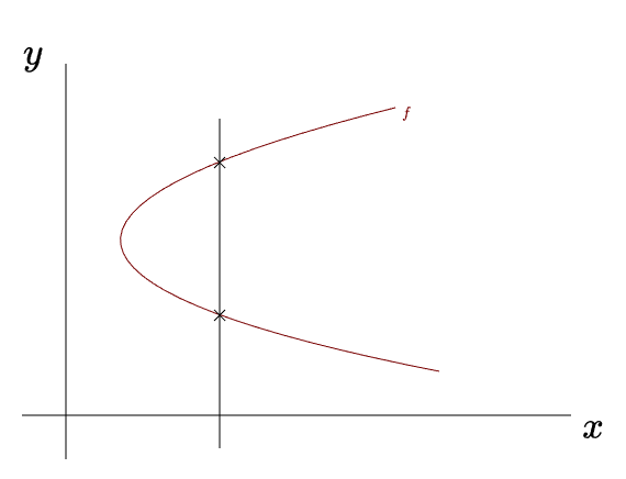 Another way to visualize this is by plotting the relationship between the sets on a graph. Imagine placing the domain on one axis and the codomain on the other. For instance, if both sets are \(\mathbb{R}\), we can represent one along the \(x\)-axis and the other along the \(y\)-axis. A map is a function precisely when it passes the vertical line test: any vertical line should intersect the graph at most once. If a vertical line crosses the graph more than once, the rule assigns multiple outputs to the same input and therefore is not a function. The following curve fails this test: