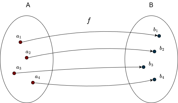 A function is bijective if it is both injective and surjective. This means that each element of \(A\) is mapped to exactly one element of \(B\), and every element of \(B\) is hit by exactly one element of \(A\). In other words, a bijection creates a perfect one-to-one correspondence between the two sets. The figure at the beginning of this section illustrates this idea.