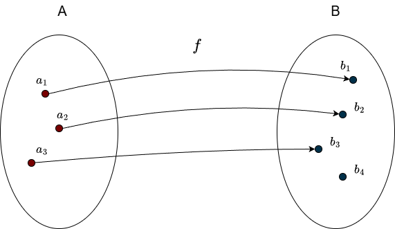 A function is injective (also called one-to-one) if no two different inputs share the same output. In other words, each element of the codomain is mapped to at most once. Formally, a function \(f:A \rightarrow B\) is injective if