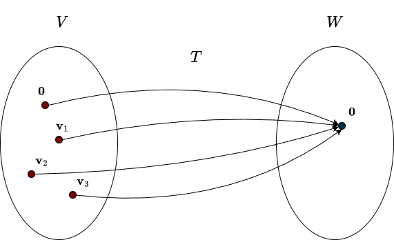 The definition above says that all the vectors that \(T\) maps to zero are gathered into a single set. This set forms a vector space, and we call it the null space, “null” hinting at the fact that it involves the zero vector. It is also sometimes referred to as the kernel. Consider the following figure: