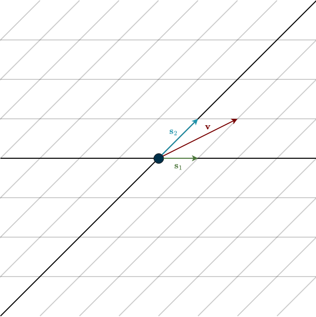 To answer this, we need to start at the beginning: our basis. The choice of basis is up to us, so we are perfectly free to choose a skewed basis, like the one below.