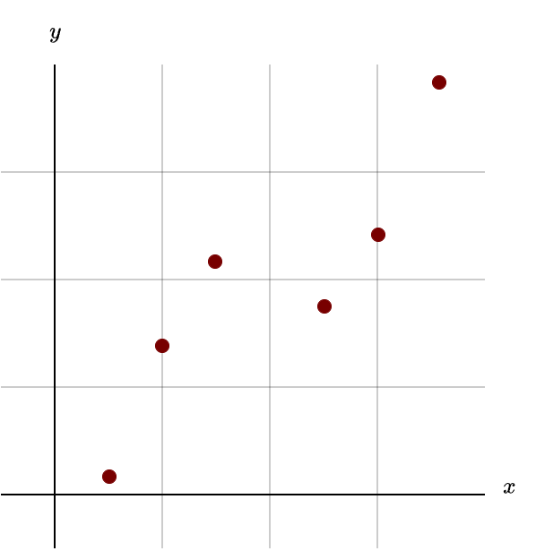 \(\begin{align} 0.1 &= w_1 +w_2 \cdot 0.5 \\ 1.2 &= w_1 + w_2 \cdot 1.0 \\ 2.1 &= w_1 + w_2 \cdot 1.5 \\ 1.8 &= w_1 + w_2 \cdot 2.0 \\ 2.2 &= w_1 + w_2 \cdot 2.5 \\ 3.9 &= w_1 + w_2 \cdot 3.0 \end{align}\)