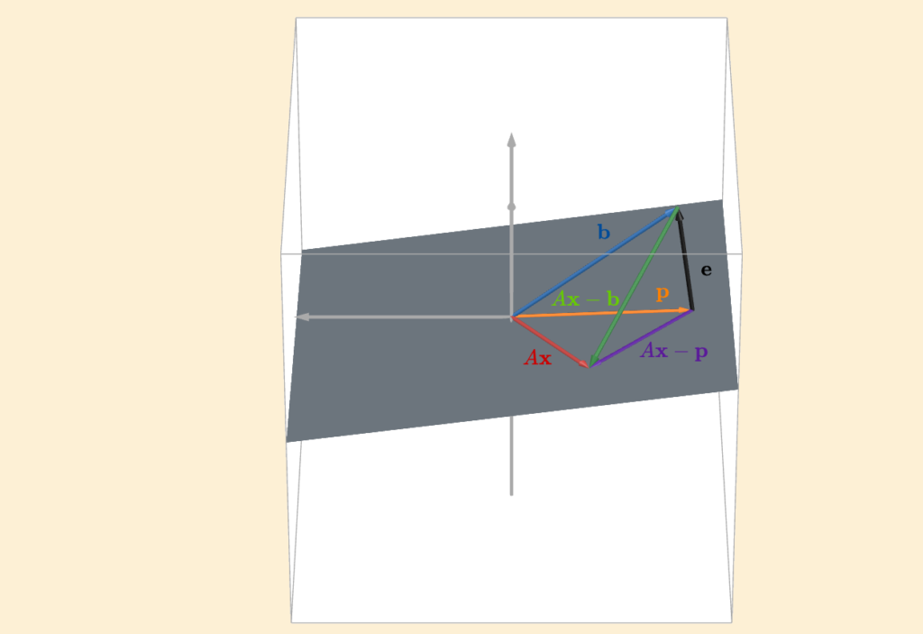 \(||A\mathbf{x} \; – \; \mathbf{b}||^2 = ||A\mathbf{x} \; – \; \mathbf{p}||^2 + ||\mathbf{e}||^2\)