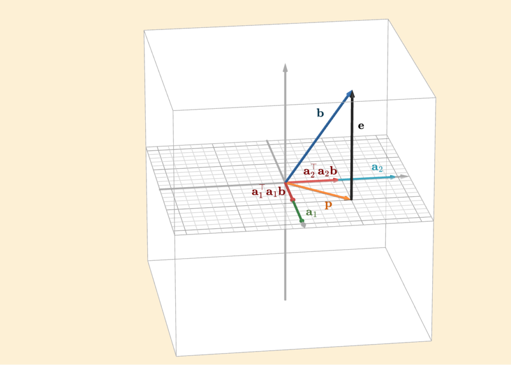 Each term in this sum contributes one component of the projection vector \(\mathbf{p}\), as illustrated in the figure. One term projects onto the direction of \(\mathbf{a}_1\), the other onto \(\mathbf{a}_2\). Adding them together gives the full projection \(\mathbf{p}\).