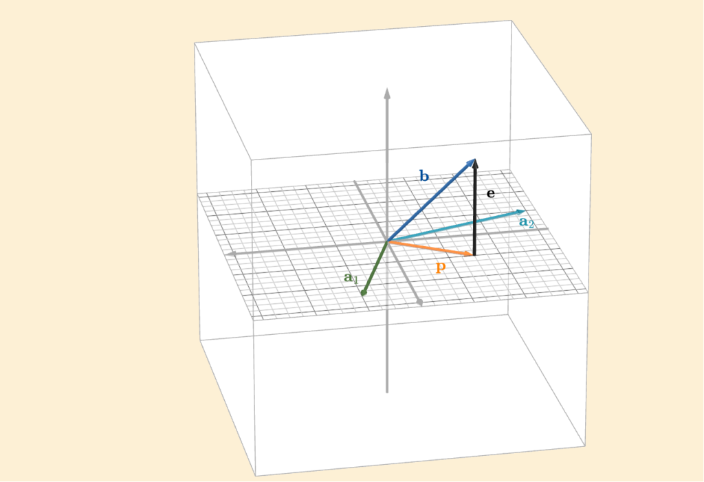 Let the columns of \(A\) be denoted by \(\mathbf{a}_1\) and \(\mathbf{a}_2\). Their span forms the column space. From the figure, we can see that the error vector \(\mathbf{e}\) is orthogonal to both \(\mathbf{a}_1\) and \(\mathbf{a}_2\), and therefore orthogonal to every linear combination of them, that is, to the entire column space. This gives us the conditions