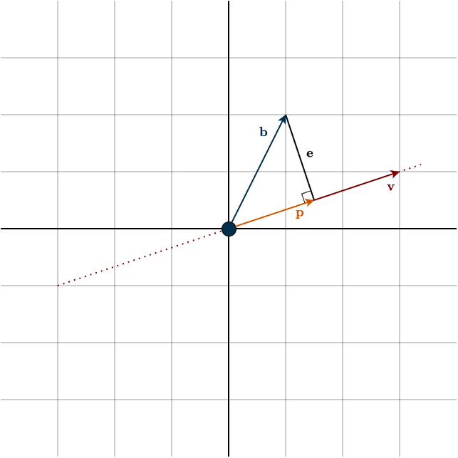 You can see that \(\mathbf{b}\) does not lie in the span of \(\mathbf{v}\) (the dotted line), which represents our column space. But what if we create a vector that is perpendicular to that span and reaches the tip of \(\mathbf{b}\)? This forms a right-angled triangle: the adjacent side is our projected vector \(\mathbf{p}\), which is the closest vector to \(\mathbf{b}\) on that line. You can clearly see that \(\mathbf{p}\) lies in the column space. The perpendicular vector \(\mathbf{e}\) represents the error, how far off we are. When a vector \(\mathbf{b}\) is projected onto a subspace, its projection \(\mathbf{p}\) is the part of \(\mathbf{b}\) that lies along that subspace. The natural question now is: how do we calculate \(\mathbf{p}\)?