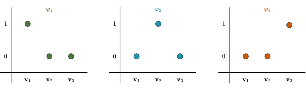 This definition may look strange at first, but don’t worry, it is actually quite easy to understand once you see what it is doing. Recall that linear functionals are functions: they take vectors as input and return numbers. After choosing a basis for a vector space \(V\), every basis vector \(\mathbf{v} \in V\) has a corresponding dual basis vector \(\varphi \in V’\). This linear functional evaluates to \(1\) on its associated basis vector and to \(0\) on all the others. For vectors that are not basis vectors, its output will generally be some number determined by linearity. If \(V\) had three basis vectors, the figure below would illustrate this behavior.
