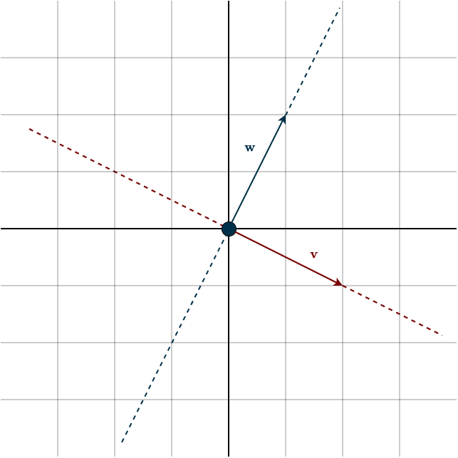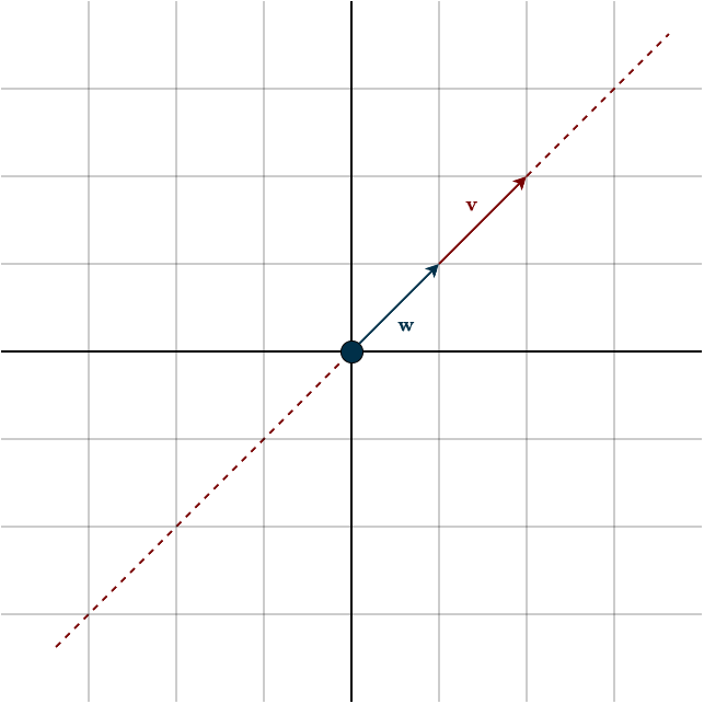 If we look at our example in the figure, we can find multiple combinations that equal zero: \(-2\mathbf{w} + \mathbf{v} = -4\mathbf{w} + 2\mathbf{v} = \dots = 0\). Not unique, not linearly independent.