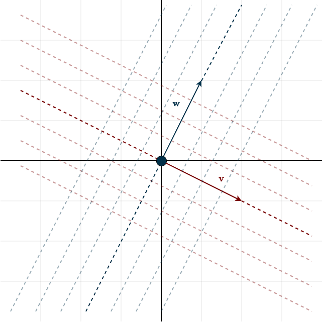 Here, the dotted lines are spaced \(\frac{1}{4}\)​ of the vector apart. So, the dotted line above \(\mathbf{v}\) represents any vector that can be written as the linear combination \(\mathbf{x} = c \cdot \mathbf{v} + \frac{1}{4} \mathbf{w} \). The dotted line along \(\mathbf{v}\) is simply offset by some factor of \(\mathbf{w}\). The same is true for the dotted lines with \(\mathbf{w}\), as they are offset by some factor of \(\mathbf{v}\). The image above illustrates the geometry. In theory, with infinite precision, these closely spaced dotted lines fill the entire plane, allowing us to create every possible vector within that space.
