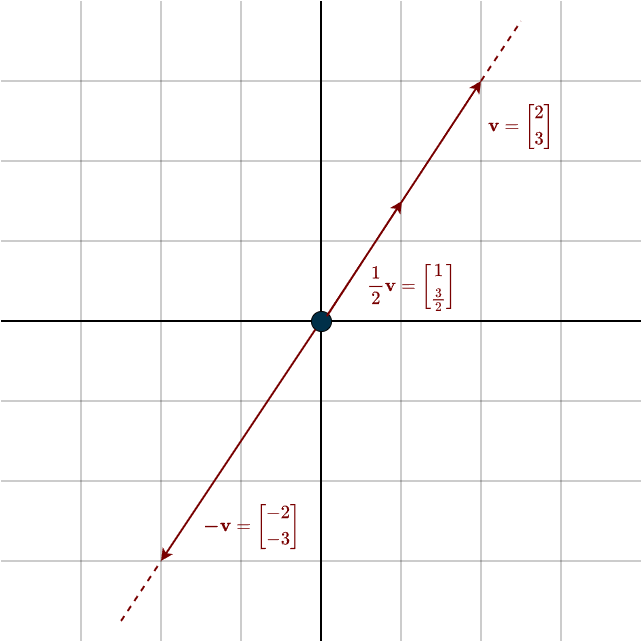 Suppose you have a vector \(\mathbf{v}\). When you scale this vector, you can generate any vector that points in the same direction—this forms a line (as shown by the dotted line in the figure below). However, you can’t produce vectors that lie in a different direction using \(\mathbf{v}\) alone.