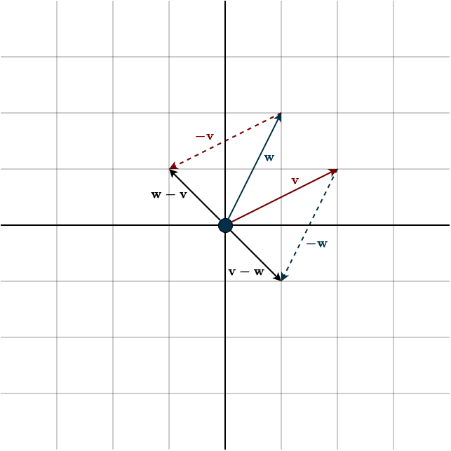 Subtraction requires a bit more attention. As we saw on the previous page, subtraction is really just addition with additive inverses. However, it’s important to note that \(\mathbf{v}-\mathbf{w}\) and \(\mathbf{w}-\mathbf{v}\) are not the same, since \(\mathbf{-v}\) and \(\mathbf{-w}\) are different. It’s also interesting to point out that the additive inverse of \(\mathbf{v}-\mathbf{w}\) is \(\mathbf{w}-\mathbf{v}\) (since \(-(\mathbf{w}-\mathbf{v}) = -\mathbf{w} + \mathbf{v} = \mathbf{v}-\mathbf{w}\)).