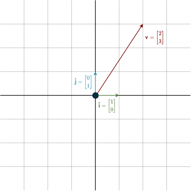 Looking at the figure at the top of the page, you’ll notice the green and blue vectors. These are basis vectors. We can easily verify that they are linearly independent because they point in different directions (or, equivalently, there is no nonzero linear combination that produces the zero vector). Moreover, they span the entire space, since two linearly independent vectors are sufficient to span \(\mathbb{R}^2\). If we were to add a third vector, it could no longer form a basis, as the set would no longer be independent. This particular basis is special and is known as the standard basis. It is the default basis assumed in linear algebra unless stated otherwise. However, the standard basis is only one choice among infinitely many possible bases.