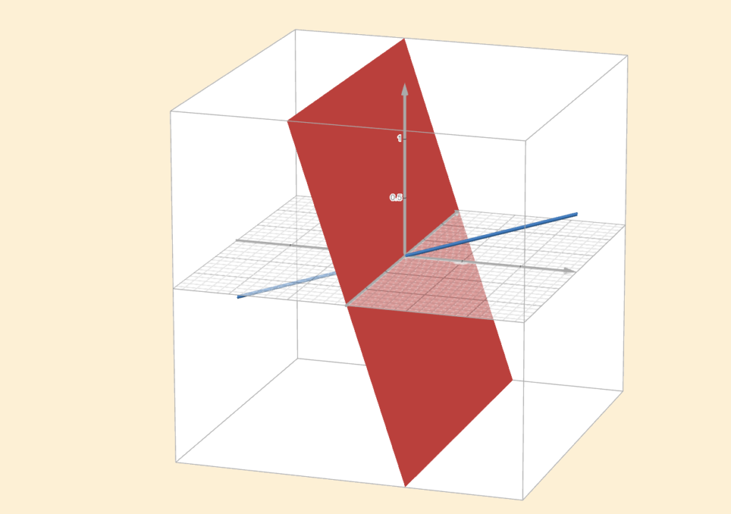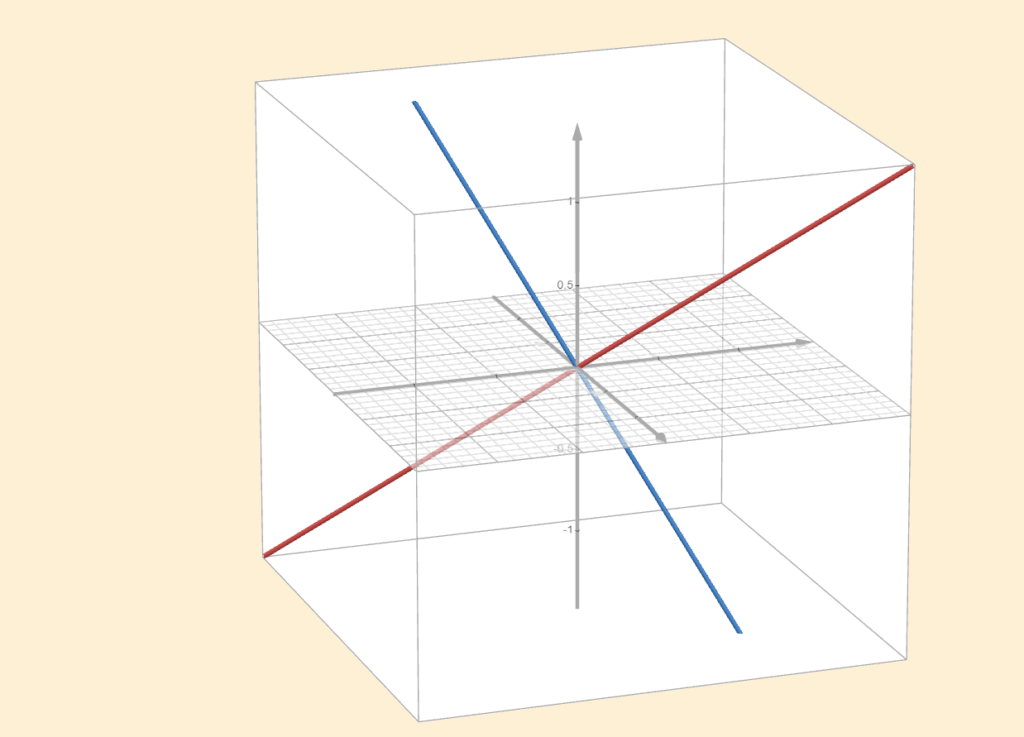If two subspaces are orthogonal to each other and their dimensions add up to the dimension of the whole space, then we call one the orthogonal complement of the other. One subspace “completes” the other by being perpendicular to it and filling the rest of the space. In the example above, the two lines are perpendicular, but neither is the orthogonal complement of the other.