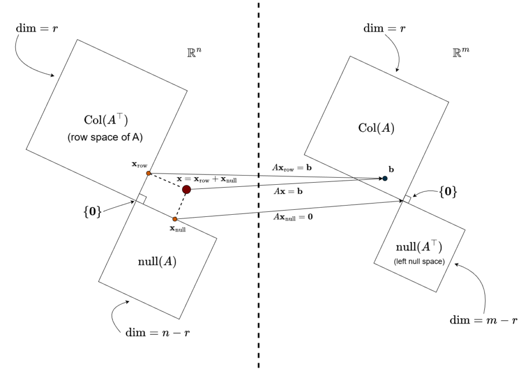 Now follow what happens under the transformation. The row space component of \(\mathbf{x}\) gets mapped to the right-hand side vector \(\mathbf{b}\), while the null space component gets sent straight to the zero vector in the output space. The dotted line in the middle of the diagram acts as a bridge, marking the passage from the input world to the output world.