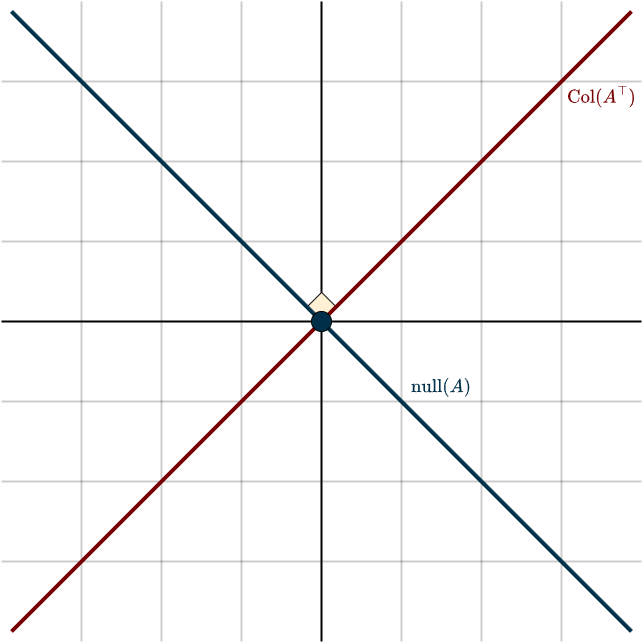 These two subspaces only share the zero vector, as indicated by the arrow in the figure. Notice also the right-angle symbol, which represents orthogonality. This is the most general case. However, remember that if \(T\) is invertible, the null space contains only the zero vector. In that situation, the null-space square in the figure essentially disappears, and everything lies in the row space, the row space fills the entire input space.